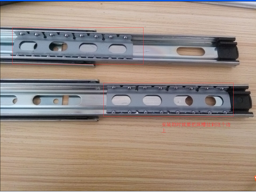 滑軌固定在柜體和抽屜側(cè)板上的時候,員工就會拿起抽屜對準(zhǔn)滑軌推進去就完全了抽屜安裝,但是當(dāng)滑軌中軌的珠糟不在邊上的時候,我們發(fā)現(xiàn),有時候安裝抽屜推進去的時候內(nèi)軌和珠糟不能重合在一起,造成推拉不順暢,員工會用力推拉進去使抽屜安裝,這樣不小心用力推拉會把珠糟上面的擋點沖壞掉,抽屜再拉出來的時候,珠糟不會跟著內(nèi)軌一起滑動,就會造成抽屜一拉就掉出來了。我們在安裝抽屜滑軌的時候,應(yīng)該把珠糟往我們這邊的方向拉到位再安裝,這樣內(nèi)軌和珠糟可以重合在一起推拉,抽屜裝好推拉順暢,不會出現(xiàn)以上所說的情況。