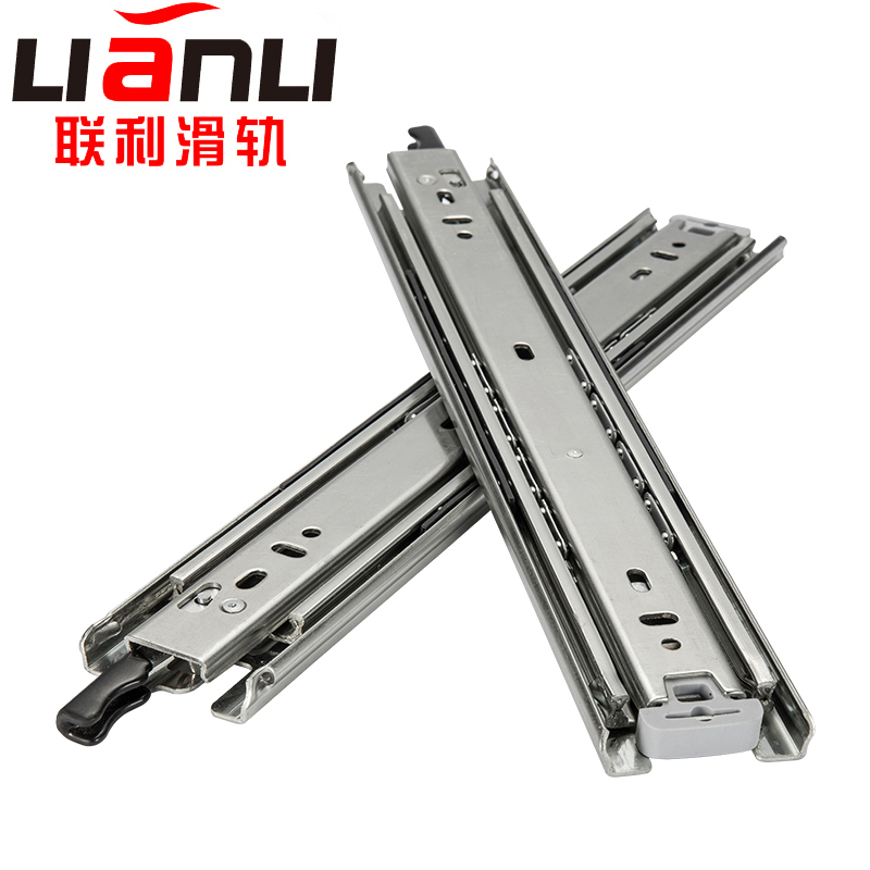 時(shí)間: 2023-06-16 10:44:04 來(lái)源: 東莞市聯(lián)利滑軌制造有限公司51寬三節(jié)重型滑軌:承重68kg/材料厚度1.5*1.5*1.5mm,表面做電鍍處理,三節(jié)滑軌全拉出,閉合多少,行程即可拉出多少。有常規(guī)款、帶鎖款、阻尼款三個(gè)款式選擇。常規(guī)款閉合端有檔膠可以卡住,正常環(huán)境抽屜下使用;帶鎖款閉合和全拉出均有鎖定功能使用在房車上或者推拉工具箱抽屜上;阻尼款抽屜快關(guān)上的時(shí)候會(huì)自動(dòng)回吸進(jìn)去,起到了很好的靜音效果。
