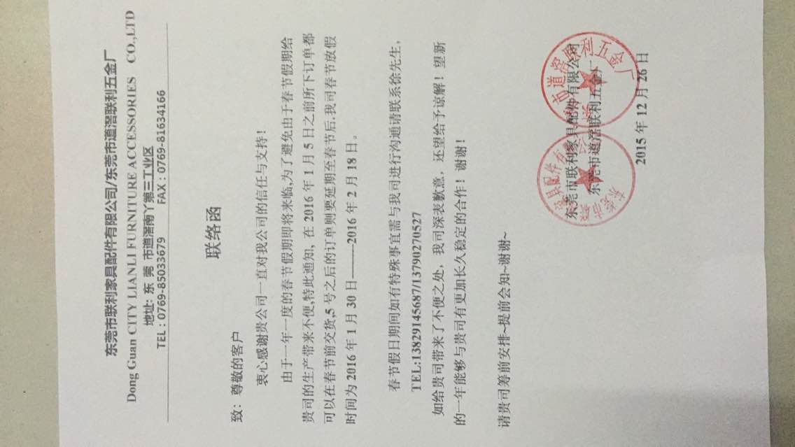 首先感謝大家在過(guò)去一年給予我公司的鼎力支持。在2015年春節(jié)即將來(lái)臨之際,聯(lián)利滑軌全體員工恭祝大家新春愉快,合家歡樂(lè),萬(wàn)事如意,猴年吉祥!!!以下是我司放假通知安排: